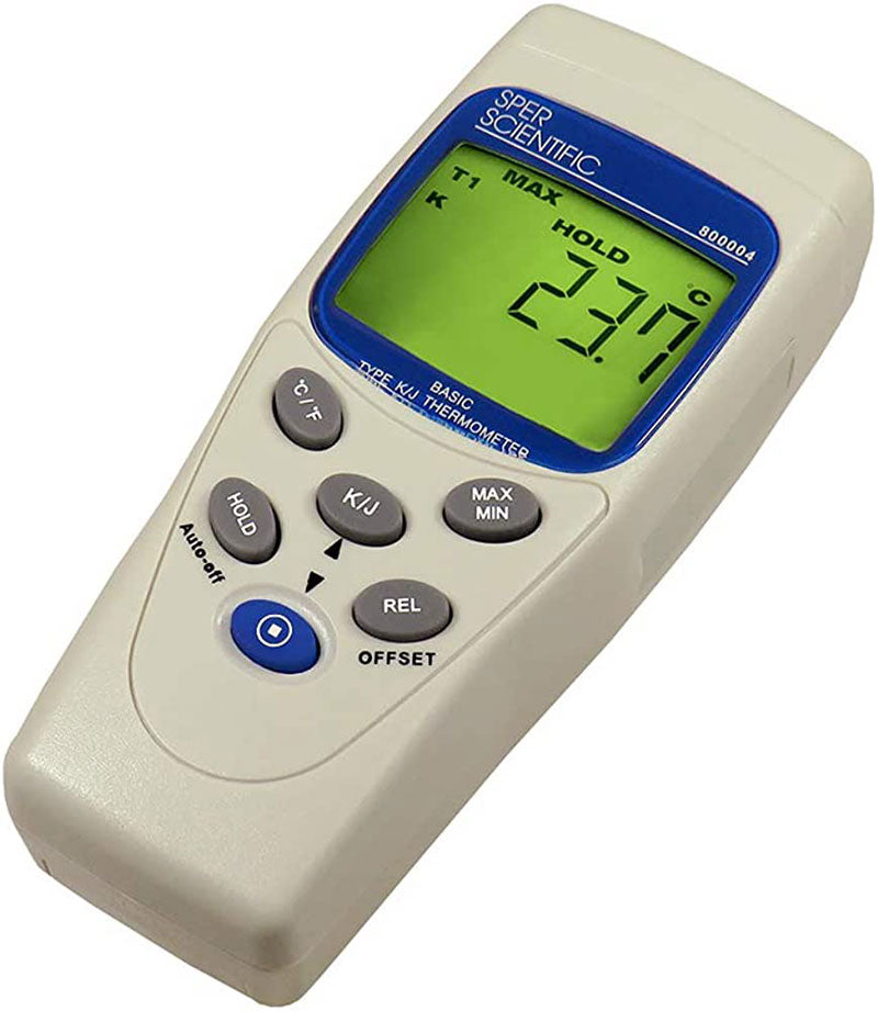 Features relative, min/max/ave temperature, hold, and touch tone buttons. Results are displayed on a large 1¼" x 1¾" LCD. An adjustment allows the user to easily calibrate to ice point or any other standard. Model 800007 will read and display results from two probes simultaneously and track the difference between them (T1-T2). Come ready to use with a 9V battery and beaded wire probe (Ambient Type K probe 800077).