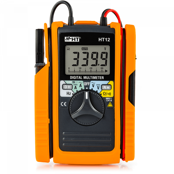 Model HT12 is a super compact digital multimeter capable o carrying out measurements of Voltage up to 600V, AC/ DC current up to 60A with integrated clamp sensor and complementary functions of Resistance, Continuity test and Frequency.